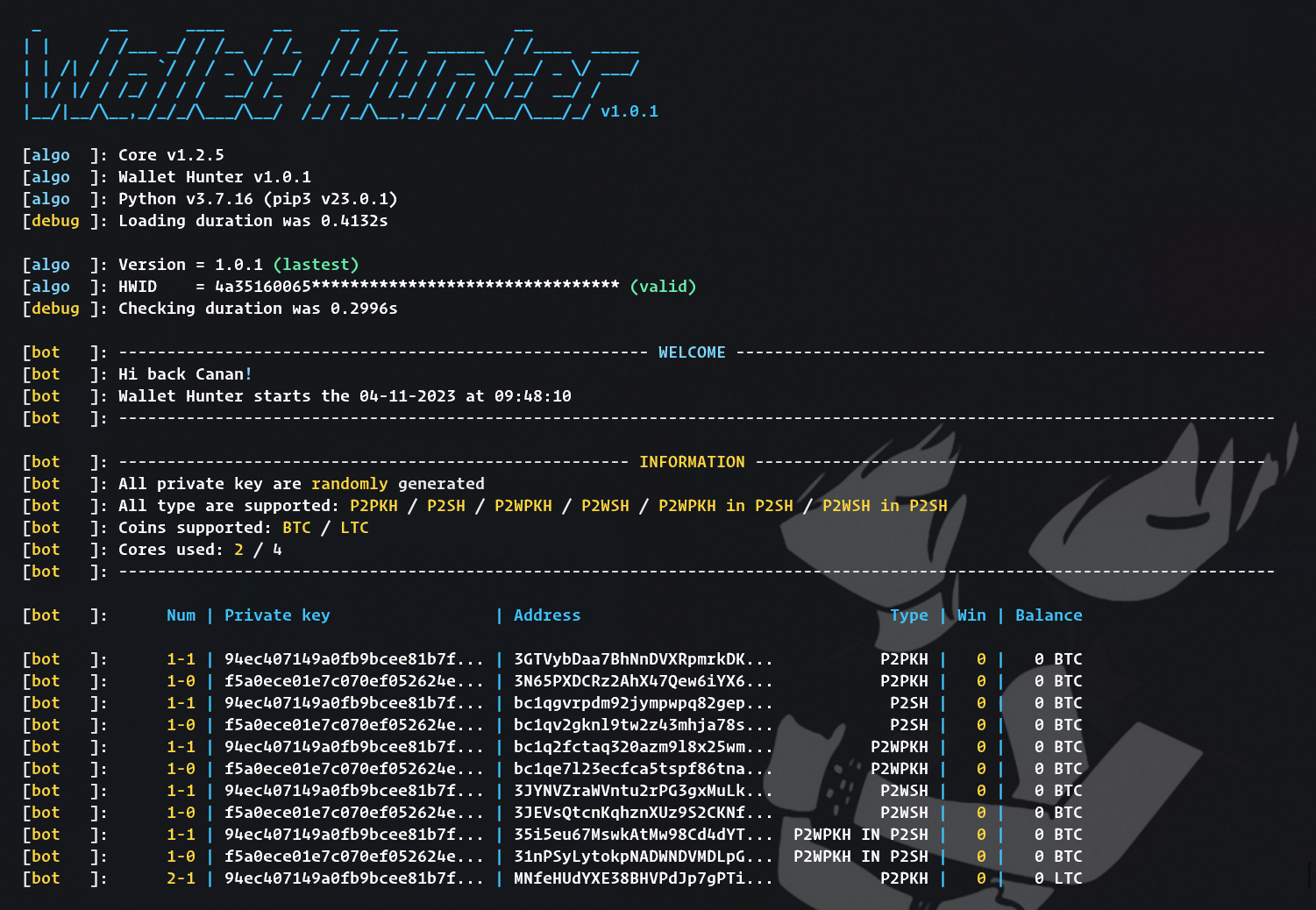 Fastest randomly private key generator and tester to find valid wallet on multi coins (BTC, LTC, LTC, DOGE, etc.) with multiple types (P2PKH, P2SH, P2WPKH, P2WSH, P2WPKH in P2SH, P2WSH in P2SH, etc.) in multi-core and multi-thread, with a human-like system serving as an anti-ban (works also with passphrase)